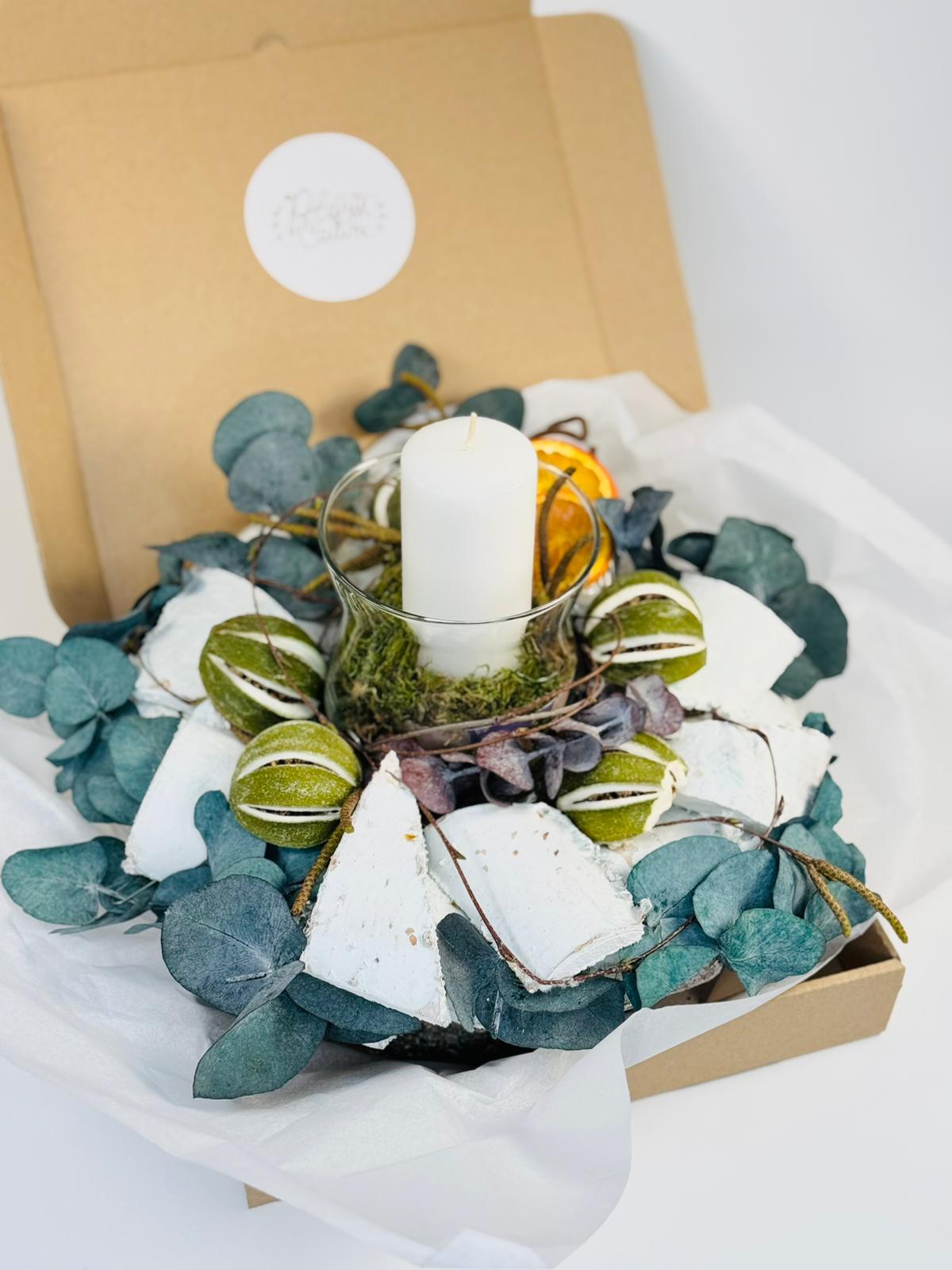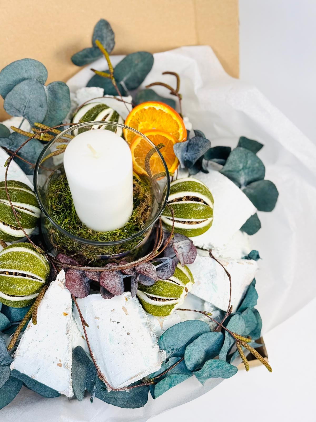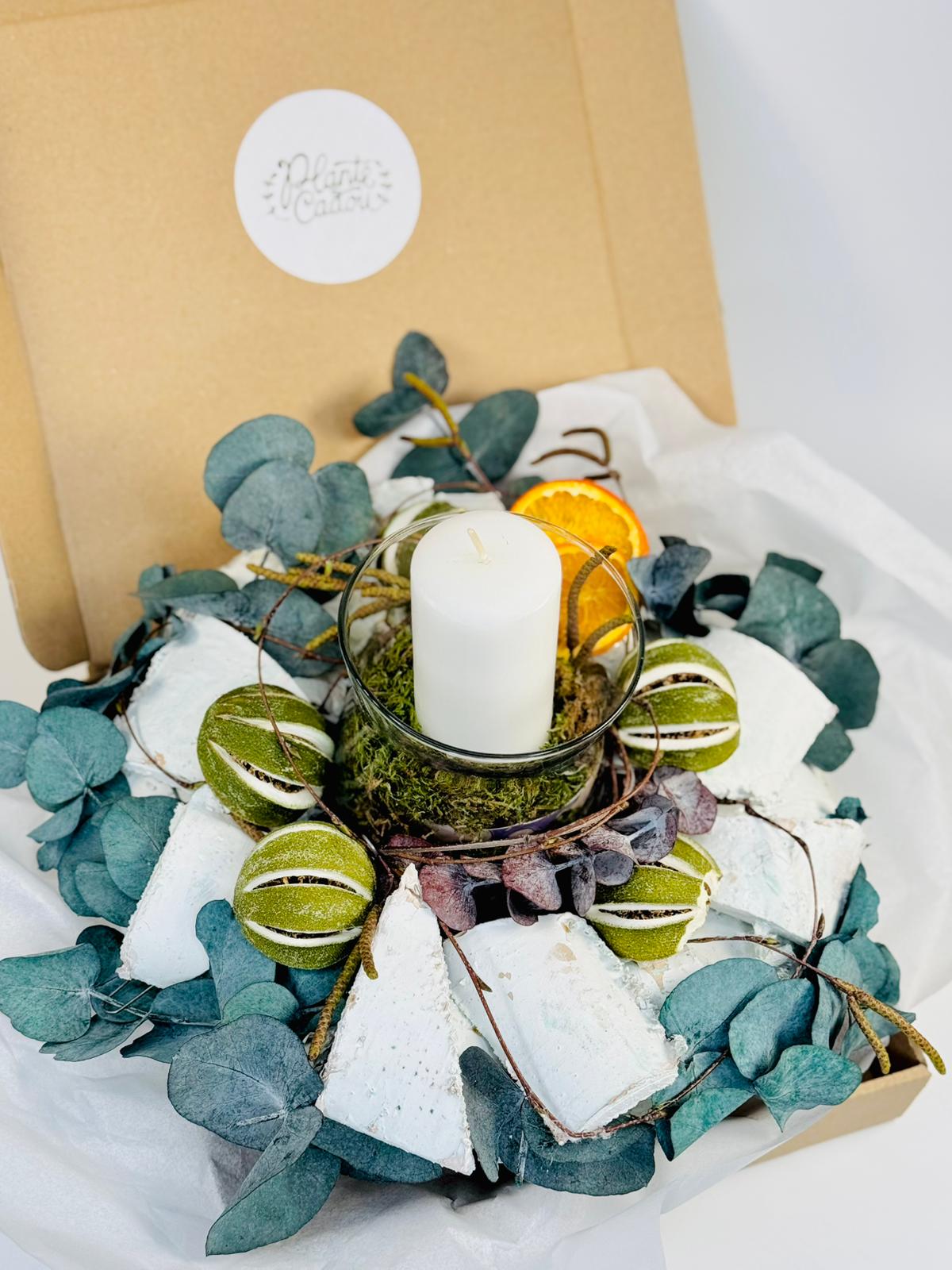 Aranjament floral prezervat cu lumanari