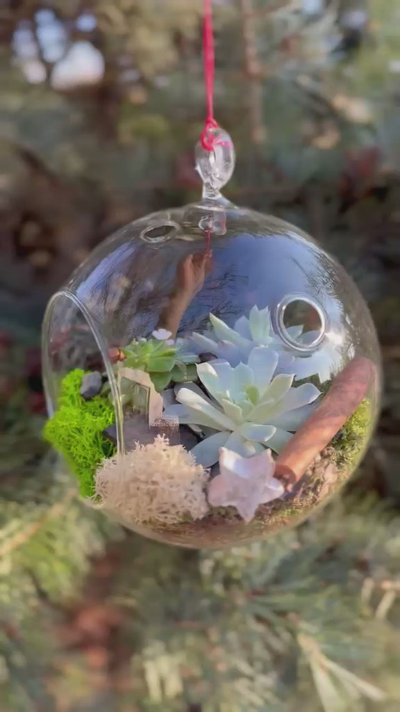 Acest glob terariu din sticla ofera o prezentare eleganta si moderna a plantelor suculente, fiind o decoratiune versatila potrivita atat pentru interior, cat si pentru a fi agatat in brad sau in alte aranjamente sezoniere. Forma transparenta pune in valoare plantele si elementele naturale din interior, creand un mini-peisaj armonios si usor de intretinut.