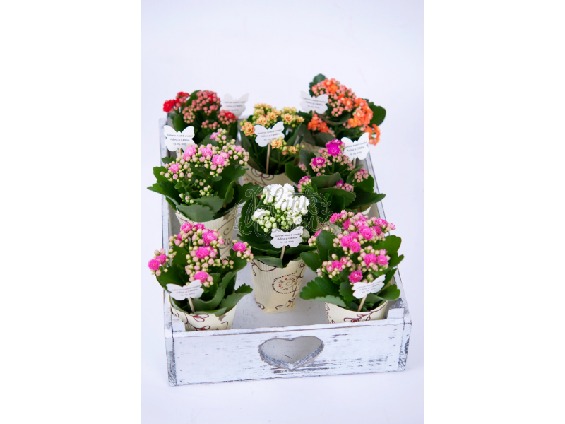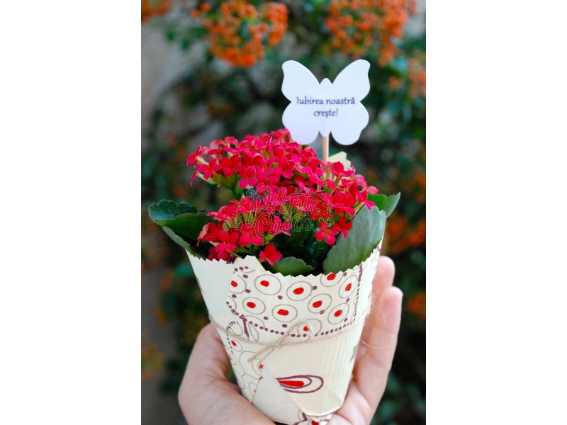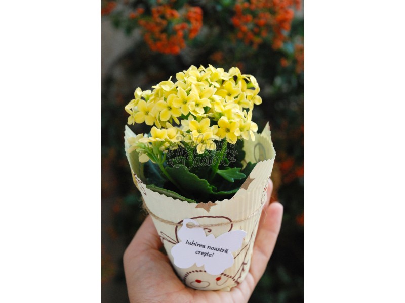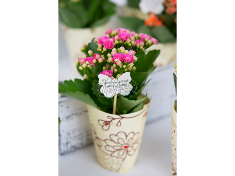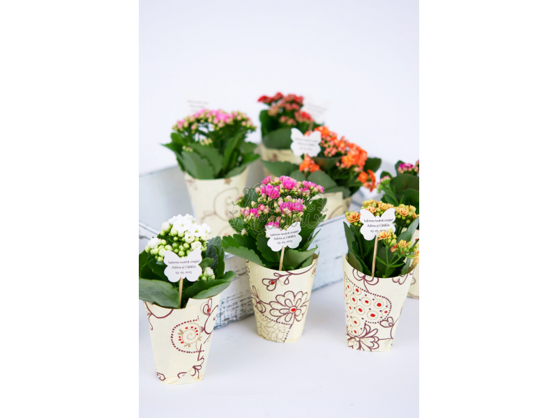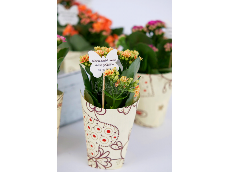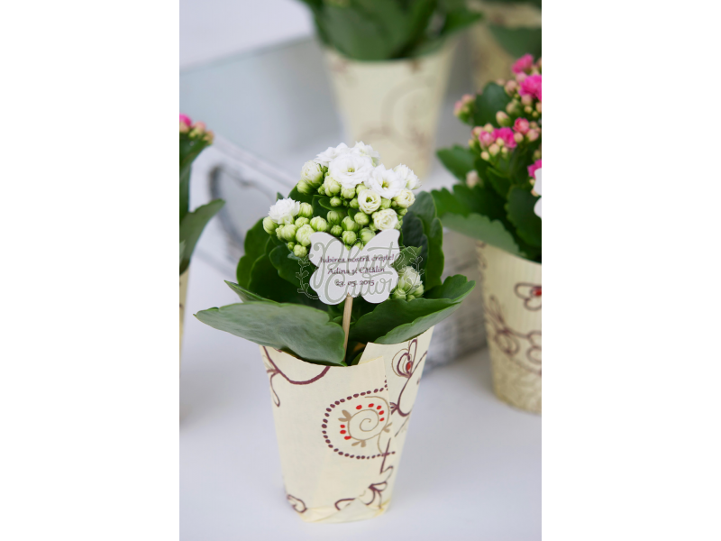 Ofera Kalanchoe la ghiveci, flori mici, vesele si colorate, cele mai frumoase marturii de nunta. Produsul este compuns din: floare Kalanchoe Calandiva in ghiveci, instructiuni de ingrijire si plantare, ambalaj decorativ de hartie imprimata (modele hartie la alegere), eticheta de carton personlizata, snur sau panglica decorativa. Acesta specie de flori este disponibila in perioada februarie-octombrie. Rezervarea sau comanda plantelor marturii este recomandat sa se faca cu cel putin 2 saptamani inainte de eveniment. Pretul este valabil pentru o cantiate minima de 20 de bucati.
