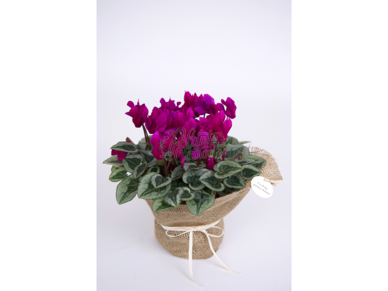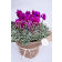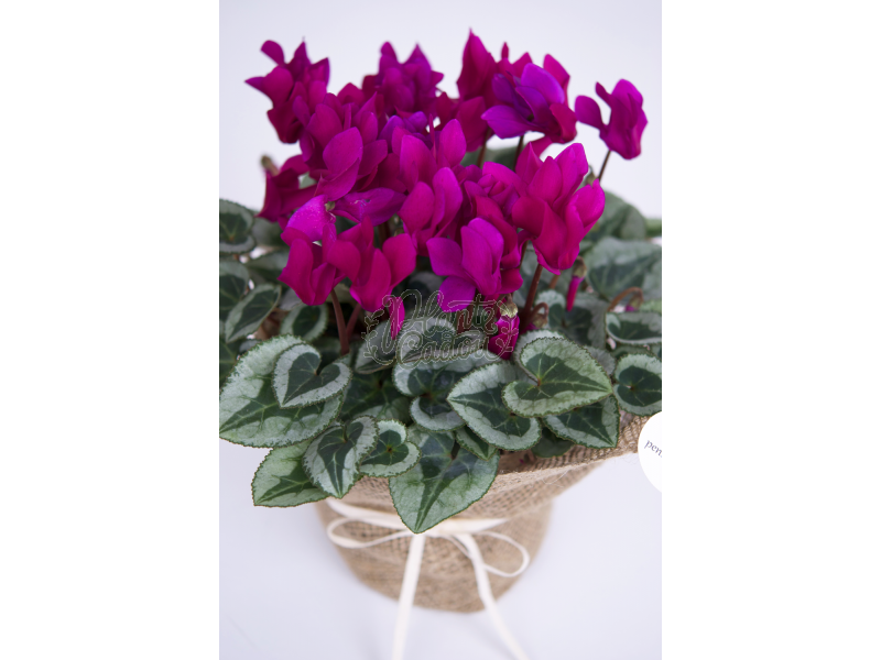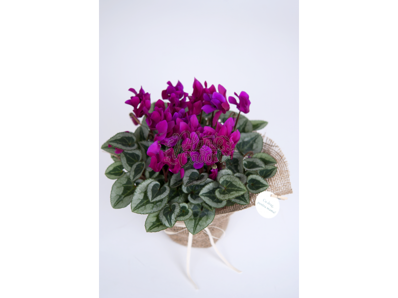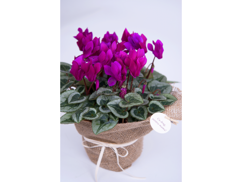 Florile Cyclamen la ghiveci sunt un cadou floral ce dureaza intreaga primavara. Produsul include: planta Cyclamen( ghiveci de plastic de 12 cm diametru), ambalaj decorativ din panza de iuta, panglica decorativa, eticheta de carton personalizata. Cyclamen infloreste timp indelungat daca este pastrata la temperaturi scazute de 10-16'C, in lumina puternica dar nu in soare direct. Florile de Cyclamen prefera umezeala si se uda prin metoda imersiei(de jos in sus), se scufunda ghiveciul in apa pana pamantul se imbiba. Produsul este disponibil in perioada ianuarie-martie si poate fi livrat prin curierat rapid oriunde in tara.