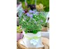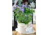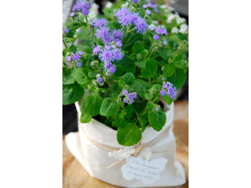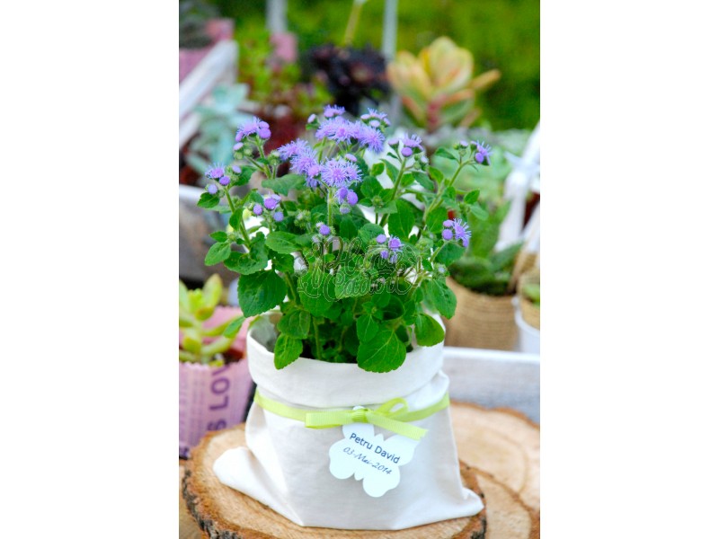 Marturii flori Ageratum in ambalaj saculeti de panza alba. Panza alba folosita pentru saculeti este de culoare alb-ivoire, este un material de bumbac rigid, cu iz vintage si aspect natural, care pune frumos in evidenta florile. Florile de Ageratum sunt livrate in ghivece mici de plastic, patrate( 7cm latura) sau rotunde de 9cm diametru. Pretul pentru florile marturii Ageratum include: planta in ghiveci, instructiuni de ingrijire si plantare, ambalaj saculet de panza alba, panglica decorativa, eticheta personalizata. Pretul se aplica pentru o cantitate minima de 20 bucati. Costurile de ambalare pentru livrare sunt incluse. Livrarea plantelor marturii la locatia dorita se taxeaza separat in functie de greutatea si volumul coletului.